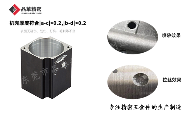 噴砂是以壓縮空氣為動力,形成高速噴射束,將噴射材料(鋼砂、玻璃砂等)噴灑到待處理的工件表面,以獲得一定的清潔或粗細表面。噴砂不僅可以處理工件表面的小毛刺。使其更加平整,提高品位,達到不同程度的高光和啞光效果——為了提高產品表面的細膩感和均勻性,一些高端產品經常使用多次噴砂。鋁合金表面多采用噴砂處理,如下圖中品華精密伺服電機附件的噴砂效果。