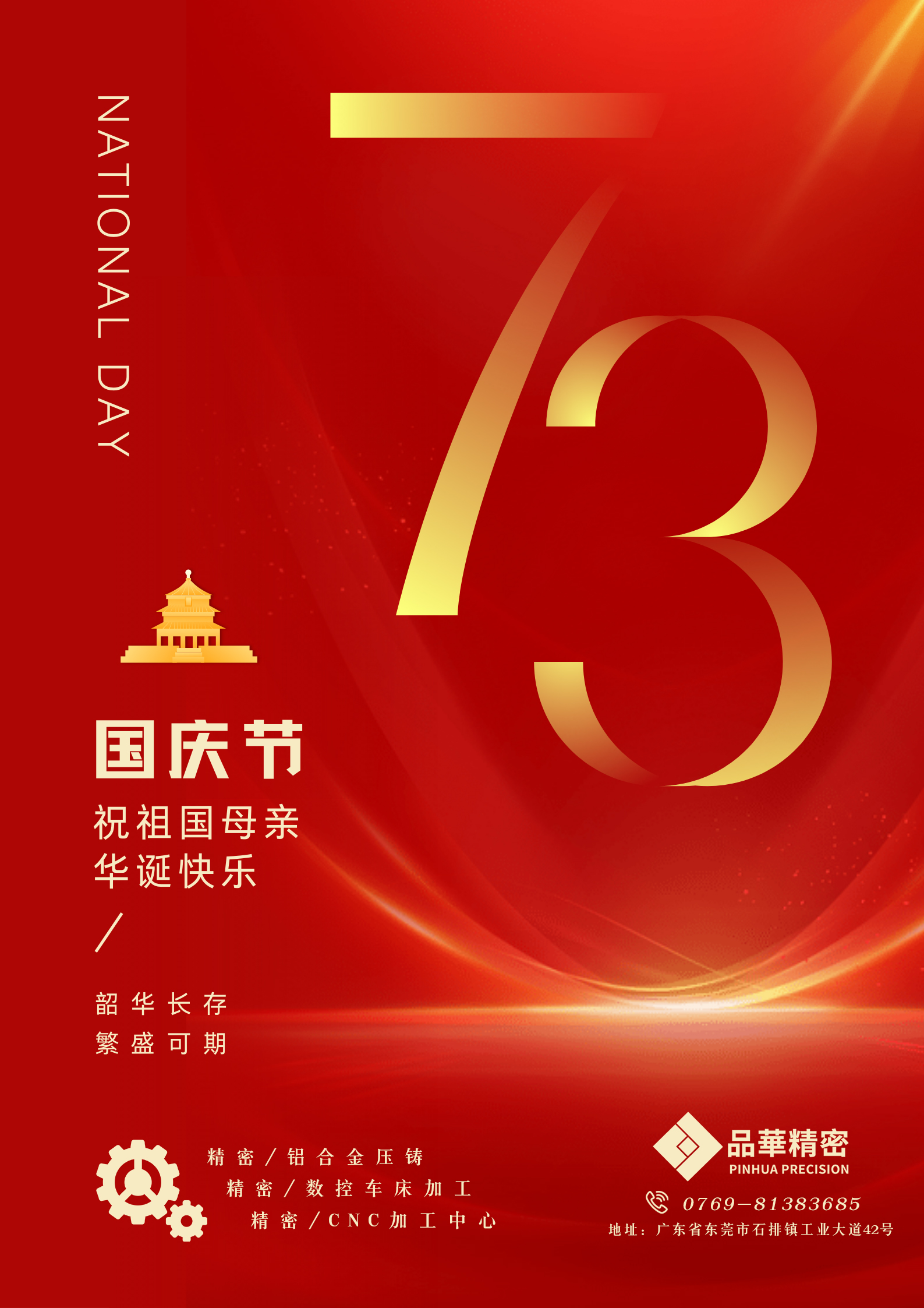 金秋十月,繁華似錦,神州大地,普天同慶。今年是新中國成立的73周年,品華精密全體員工給各位新老客戶獻上最真摯的祝福,感謝大家一直以來對品華精密的支持與信任,因放假帶來的不便之處,敬請諒解!